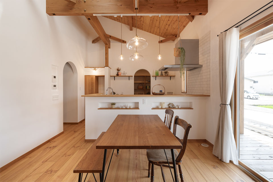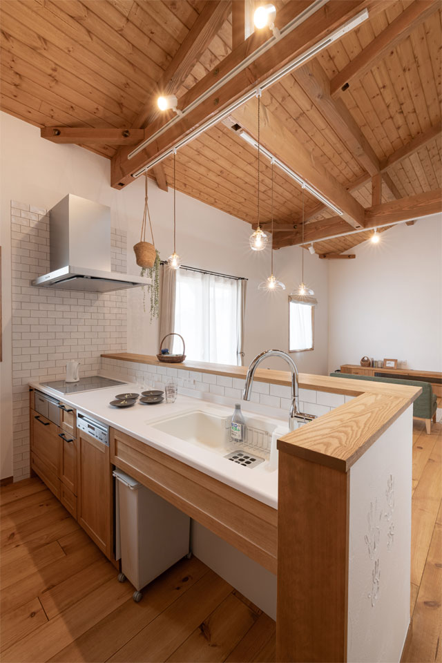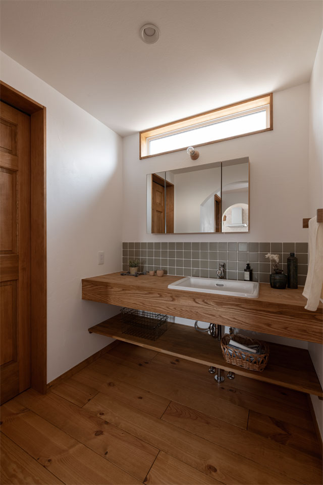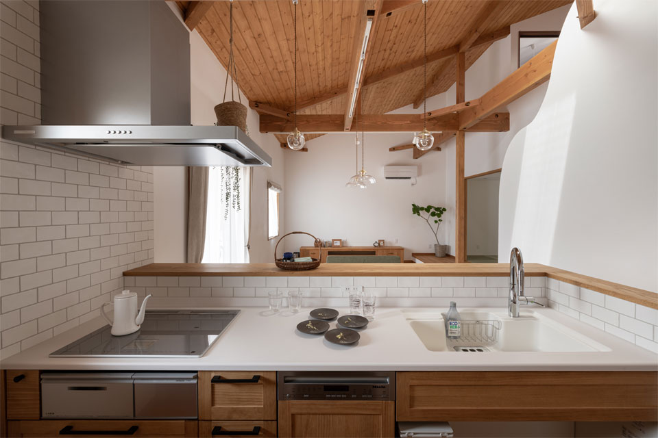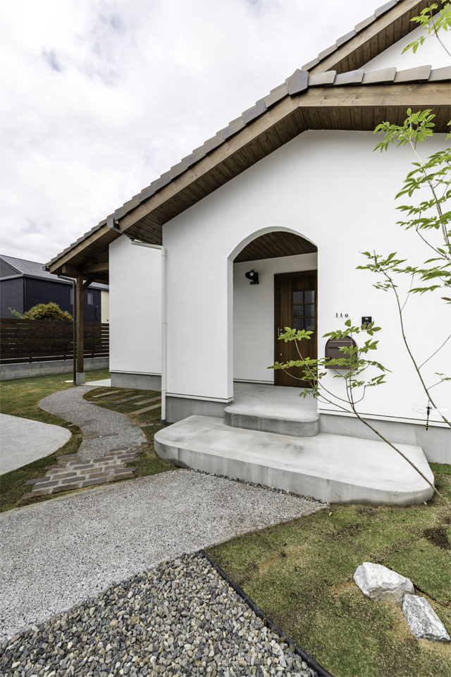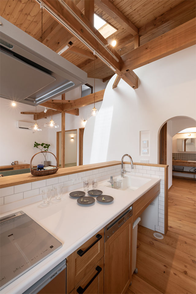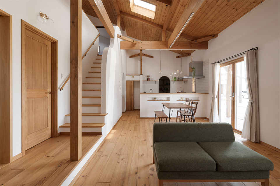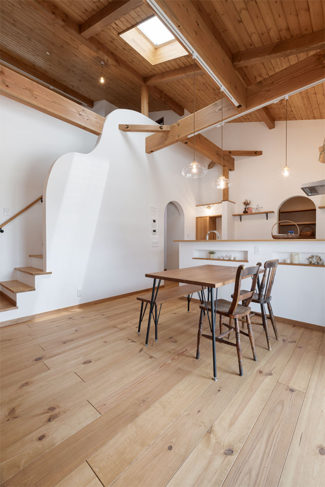 内外装はすべて自然素材仕上げ。真っ白な漆喰塗り壁、天然木の床、造作のキッチンや洗面、収納まで、シンプルでありながら“少し特別なかわいさ”がそっと散りばめられています。ナチュラルな質感のフラットな屋根瓦、モルタル仕上げの玄関など、素朴なテイストも心地よく調和しています。
