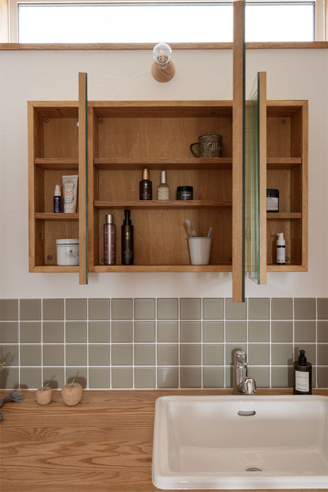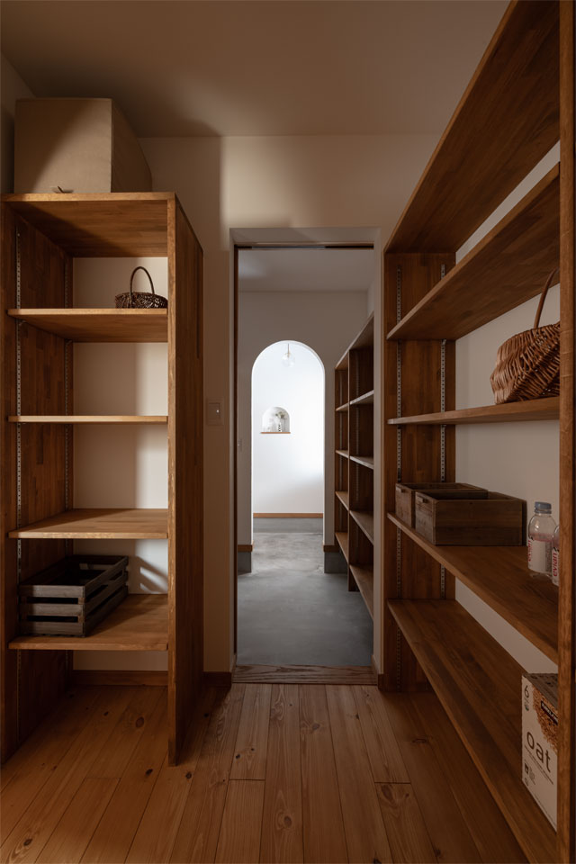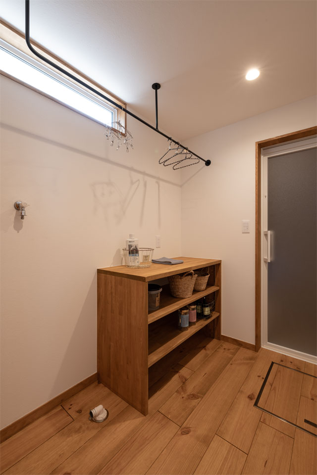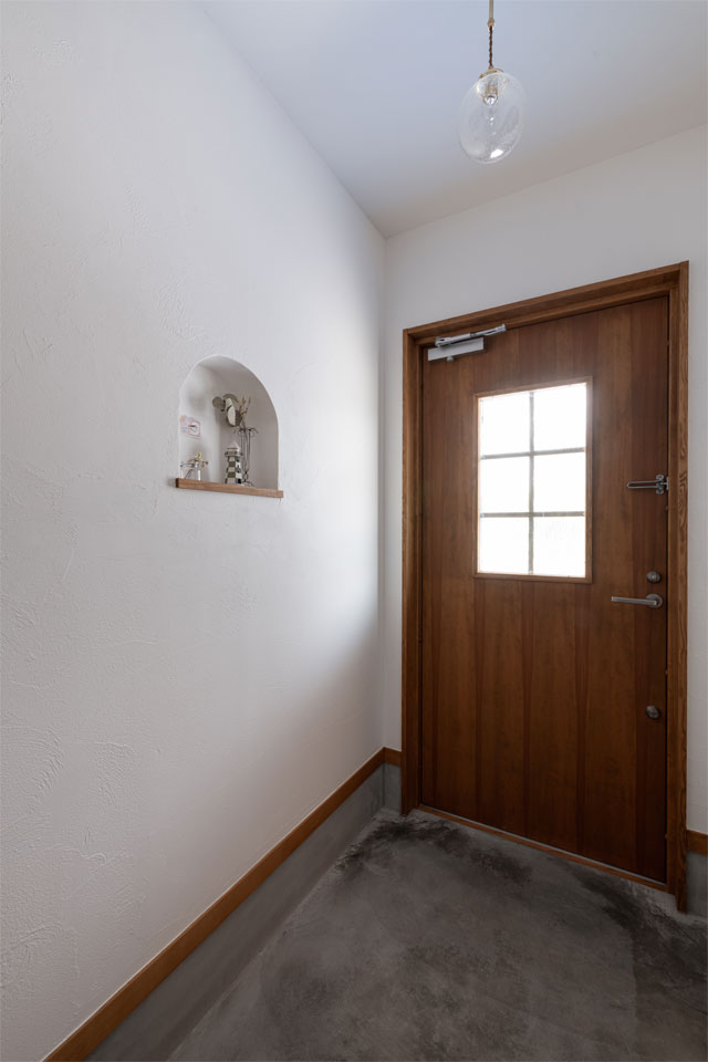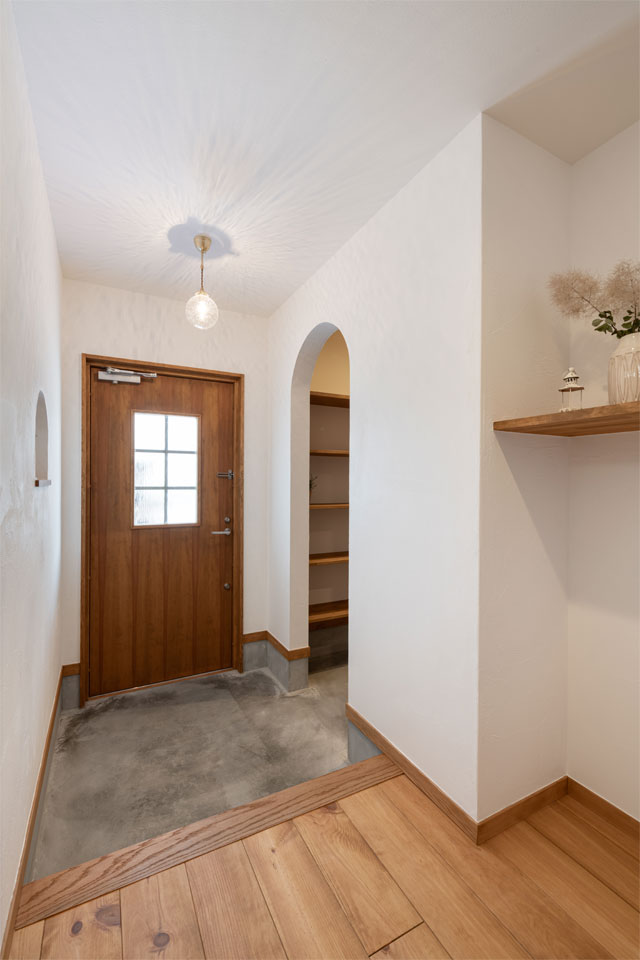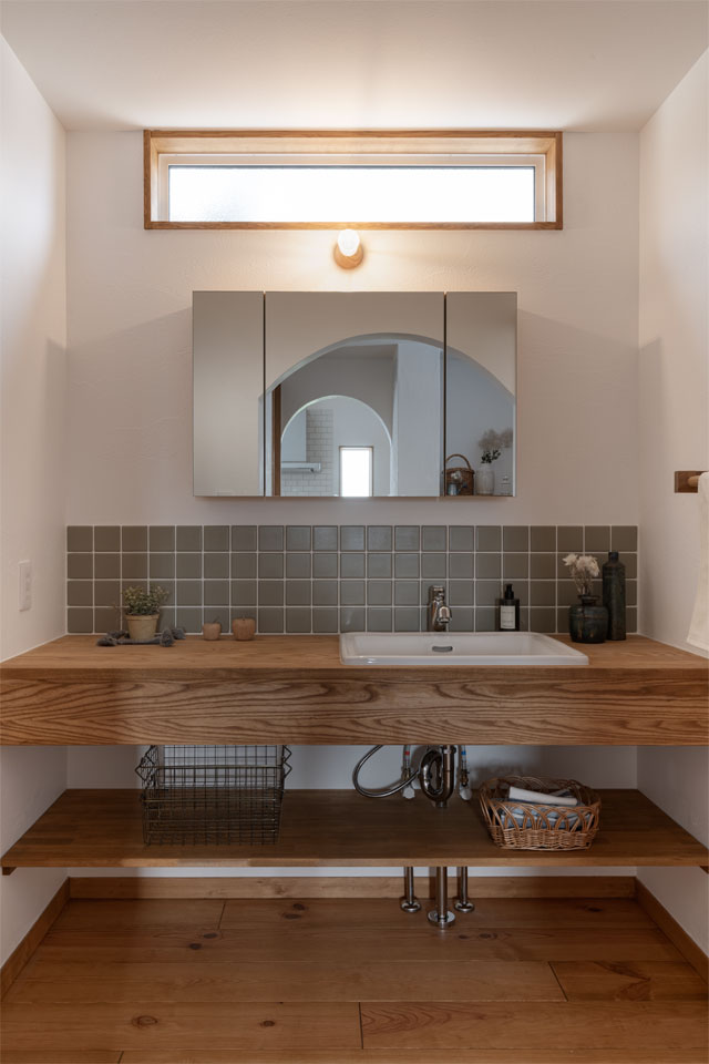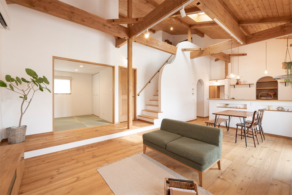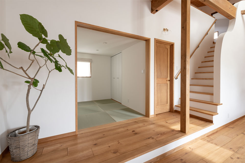 内外装はすべて自然素材仕上げ。真っ白な漆喰塗り壁、天然木の床、造作のキッチンや洗面、収納まで、シンプルでありながら“少し特別なかわいさ”がそっと散りばめられています。ナチュラルな質感のフラットな屋根瓦、モルタル仕上げの玄関など、素朴なテイストも心地よく調和しています。